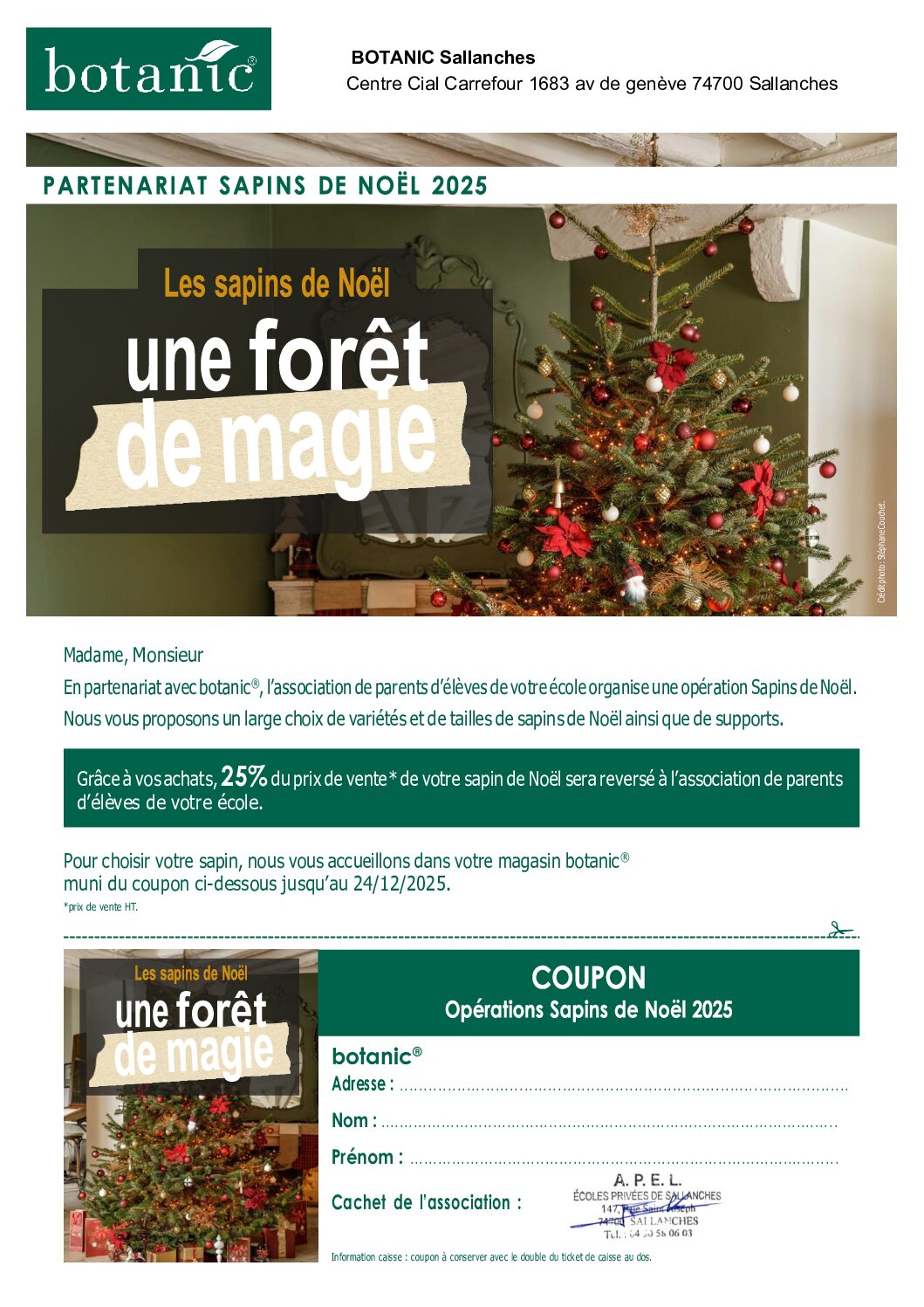 L’APEL vous propose un partenariat avec le magasin Botanic Sallanches pour l’achat de votre sapin de Noël naturel